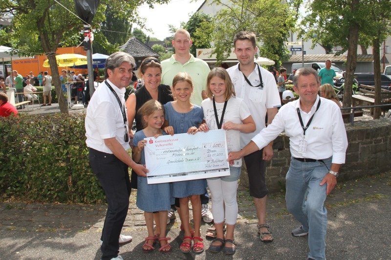 “Das ist einfach unglaublich – aber genial schön“, Organisationsleiter Peter Schlömer (Daun) strahlte schon zu Beginn des Shakedown am legendären ‚Mantaloch‘ in Brück. Gleich zum Auftakt des ADAC Eifel Rallye Festival (25.-27. Juli 2013) gab es eine neue Bestmarke. „Um 17.00 Uhr hatten wir bereits knapp 6.000 Gäste gezählt, und es kommen immer noch mehr dazu“, berichtete Schlömer. Harald Demuth, der zweifache Deutsche Rallye-Meister ergänzte, „einfach nur genial was hier los ist, du fährst durch ein richtiges Spalier an Fans.“ Am Dorfbrunnen standen die VIP-Teams mit ihren Fahrzeugen und waren umringt von Fans mit Autogrammwünschen. Vor allem Walter Röhrl, Schirmherr und zweifacher Weltmeister, war das Ziel unzähliger Fans und flachste, „nachdem was ich heute hier schon unterschrieben habe, können wir die Autogrammstunde morgen in Daun ausfallen lassen, da kann doch eigentlich keiner mehr kommen.“ Auch Christian Geistdörfer war begeistert, „Vollgeparkte Parkplätze und viel Menschen mit einem Lächeln im Gesicht – scheinbar haben wir den Geschmack der Fans getroffen.“ Gleich mehrfach konnte der MSC Daun als Veranstalter des Festivals in Brück Spenden übergeben. So hatte Philipp Gerick eine Mitfahrt bei Walter Röhrl ersteigert, den Erlös von 1.600 Euro erhielt das Projekt „Ein Schulhof zum Erleben, Entdecken und Bewegen“ des „Förderverein der Grundschule Daun e.V.“ Petra Schmitz als Vertreterin der Eltern und Schulleiter Christian Irle nahmen diese Unterstützung Ihrer Aktion gerne entgegen.