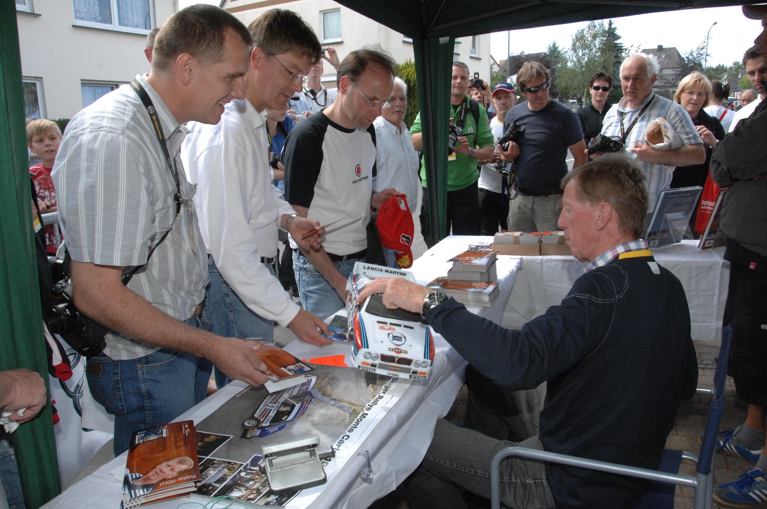 PM04-Autogrammstunde Roehrl-RBHahn.jpgDoppelweltmeister Walter Röhrl übernimmt auch in diesem Jahr wieder die Schirmherrschaft für das Eifel Rallye Festival. Der lange Regensburger ist immer noch ein begehrter Autogrammgeber – wo er auftaucht bilden sich sofort lange Schlangen mit Fans. Auch diesmal wird er für Autogrammstunden in der zur Rallye- Meile umgebauten Innenstadt von Daun zur Verfügung stehen. Er pilotiert wieder einige Fahrzeuge aus seiner aktiven Laufbahn. Geplant sind die Starts auf einem Porsche 911er, einem Audi S1 quattro, einem Opel Ascona 400 und einem Opel Ascona A. „Es gibt wohl nirgendwo sonst ein Aufeinandertreffen so vieler originaler Gruppe-B-Autos“, gerät Röhrl ins Schwärmen. „Und das Schöne an dieser Veranstaltung ist, es gibt keinen Wettbewerb. Jeder kann selbst entscheiden, wie er fährt. Es soll kein Stress für die Rallye-Boliden sein, im Vordergrund steht der Spaß daran, so tolle Autos bewegen zu können und dabei den Fans nochmals den Original-Sound zu präsentieren.“ In der Dauner Rallye-Meile werden zusätzlich viele Einzelstücke und (noch) nicht lauffähige Originale ausgestellt, „das ist einmalig, einfach unvergleichlich.“ Der knappe Kommentar der Rallye-Ikone: „Diese Veranstaltung in der Eifel ist für mich der Inbegriff eines Rallye Festivals – es gibt nichts Vergleichbares.“