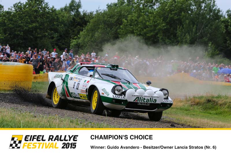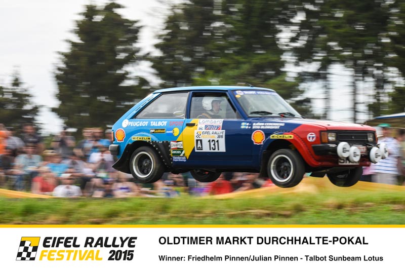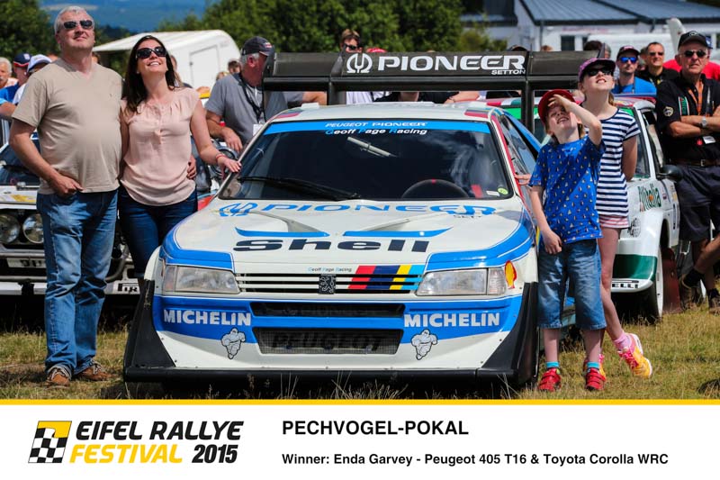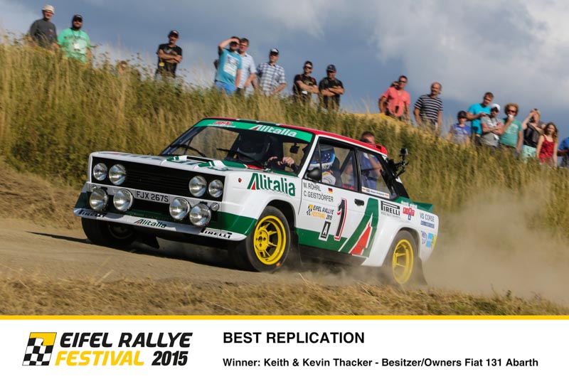 Kernstück des Eifel Rallye Festivals ist es, dass es keinerlei Zeitwertung gibt. Mit den historischen Rallye-Boliden wurden reine Demonstrationsfahrten absolviert. Dennoch gab es bei der Rallye-Party am Samstagabend Siegerehrungen. Experten-Juries wählten die Sieger in den verschiedenen Kategorien. Als „Best original rally car“ (schönstes Original) wurde der Nissan 240RS, pilotiert von Achim Loth und Sebastian Jeub, geehrt. Dieses Auto schaffte die Rückverwandlung von absoluter Schrottreife in Afrika in den Originalzustand. Die Auszeichnung als „Best replication“ (schönster Nachbau) ging an den Fiat 131 Abarth, den sich Walter Röhrl und Timo Salonen teilten. Es ist ein kompletter Neubau, bei der Umwandlung in eine originalgetreue Kopie des ehemaligen Werkswagens mussten viele Teile von Rallysport Development im Norden Englands selbst hergestellt werden. Der erste Titel als „Rallying Ambassador“ (Botschafter des Rallyesports) ging an Helmut Deimel. Der österreichische Kultfilmer wurde für seine herausragenden filmischen Dokumentationen des Rallye-Sports ausgezeichnet. Eine ganz besondere Auszeichnung gab es durch die fünf anwesenden Champions. Mit der „Champion’s Choice“ ehrten Röhrl, Munari, Mikkola, Blomqvist und Salonen den original Lancia Stratos, das Siegerauto der Rallye Monte Carlo 1977 als ihr Lieblingsauto des Festivals 2015. Darüber hinaus wurde der Oldtimer-Markt-Durchhalte-Pokal an Friedhelm und Julian Pinnen vergeben. Bei dem Sprung auf der Bosch Super Stage zerbarst die Lenkung an ihrem Talbot Sunbeam Lotus. Über Nacht wurde eine neue Lenkung aus Duisburg organisiert, nach Daun gebracht und rechtzeitig zum Start der Samstagsetappe wieder eingebaut. Enda Garvey und Co-Pilotin Jennifer Lerch hätten hingegen auf die Auszeichnung mit dem Pechvogel-Pokal gerne verzichtet. Ihr Peugeot 405 Pikes Peak, der nur bei der Festival-Parade teilnehmen sollten, blieb schon am Start mit technischen Defekten liegen, zudem war der extra aus Irland angereiste Garvey gesundheitlich angeschlagen.