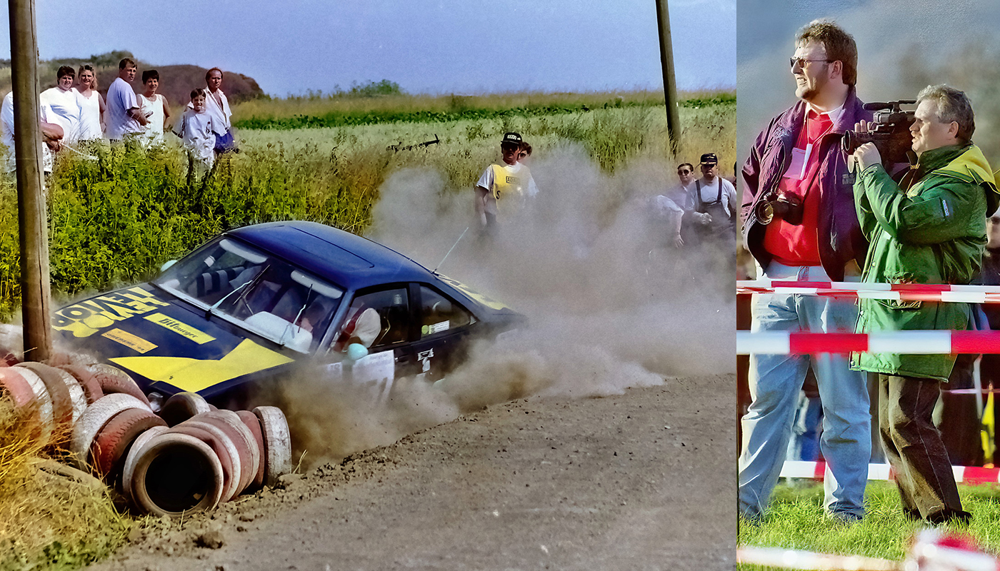 Das Foto zeigt den filmenden Mann aus Hüttigweiler. Neben ihm Jürgen Hahn, heute Pressechef des Eifel Rallye Festivals. Sascha Dörrenbächer ist von Beginn an der Chef-Fotograf des Festivals.